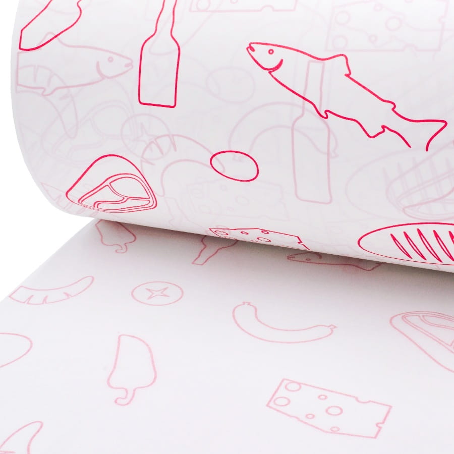 Biały papier powlekany PE z czerwonym nadrukiem tematycznym „Serki, Rybki”. Najbardziej wydajna wersja rolki (650 metrów) do pakowania nabiału i ryb.