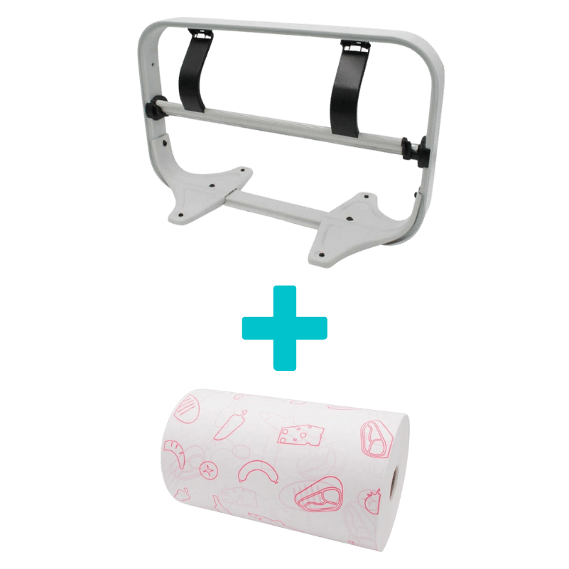 Kompletny zestaw dla gastronomii i handlu: uniwersalny odcinacz z ząbkowaną listwą oraz wydajna rolka białego papieru powlekanego PE (35 cm, 10 kg). Gwarantuje błyskawiczne pakowanie jedną ręką oraz 100% barierę przed tłuszczem i wilgocią.
