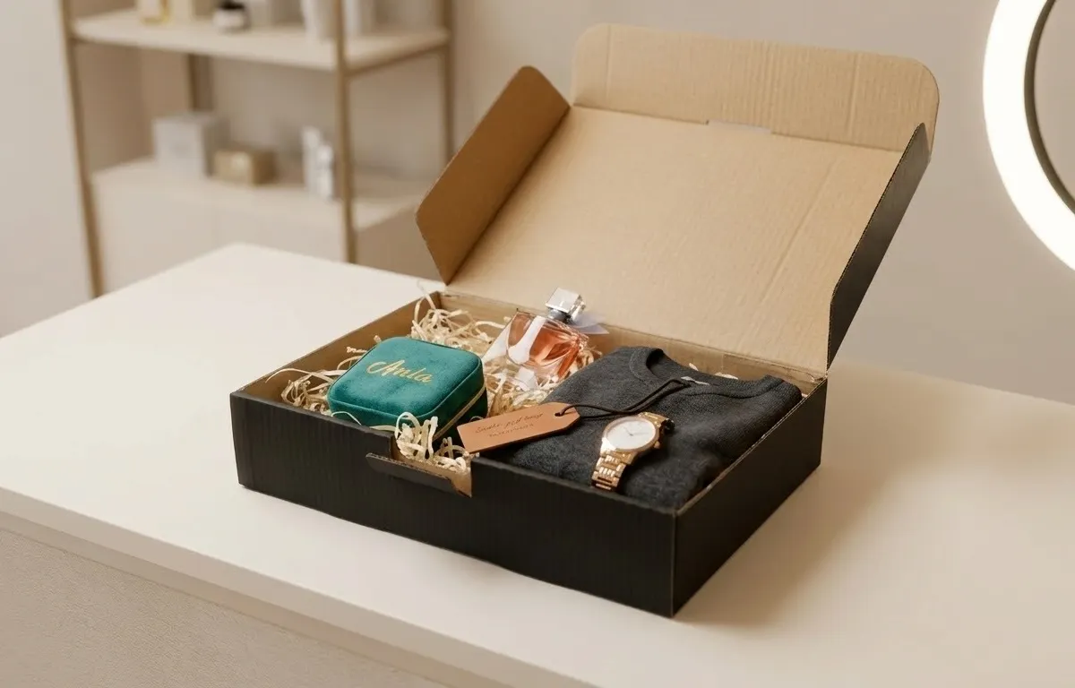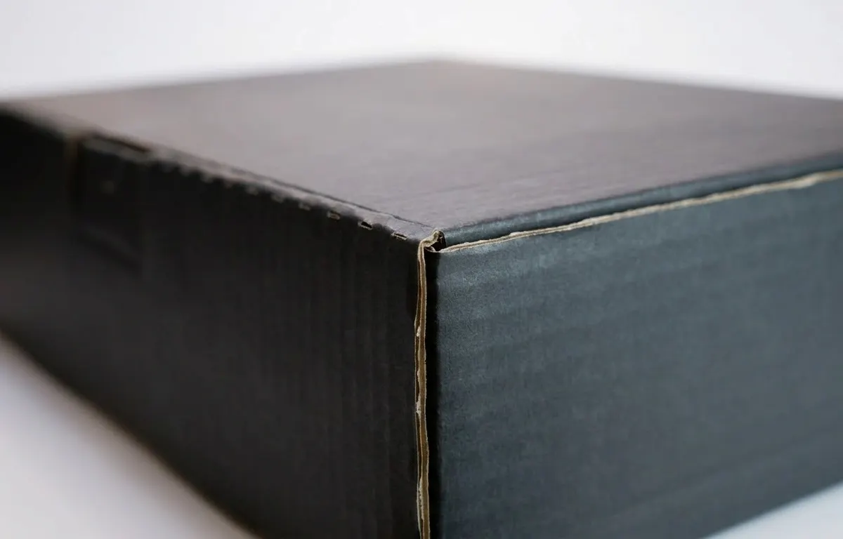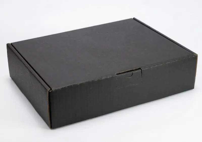 Karton fasonowy o wymiarach 350 x 250 x 80 mm, wykonany z 3-warstwowej tektury falistej (mikrofala). Pudełko zostało zaprojektowane z myślą o sklepach e-commerce oraz wysyłce przedmiotów w formacie A4. Zewnętrzna, barwiona na czarno powłoka tektury zapewnia estetyczny wygląd przesyłki, podczas gdy jej wnętrze pozostaje w naturalnym, brązowym kolorze.