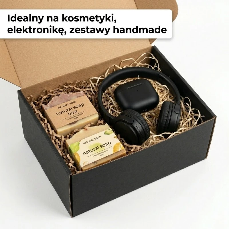 Karton fasonowy o eleganckim czarnym wykończeniu, wykonany z 3-warstwowej tektury falistej (mikrofala). Dzięki swoim wymiarom wewnętrznym (207 x 158 x 111 mm), pudełko jest niezwykle uniwersalne i doskonale nadaje się do pakowania produktów w branży e-commerce, kosmetycznej czy rzemieślniczej.