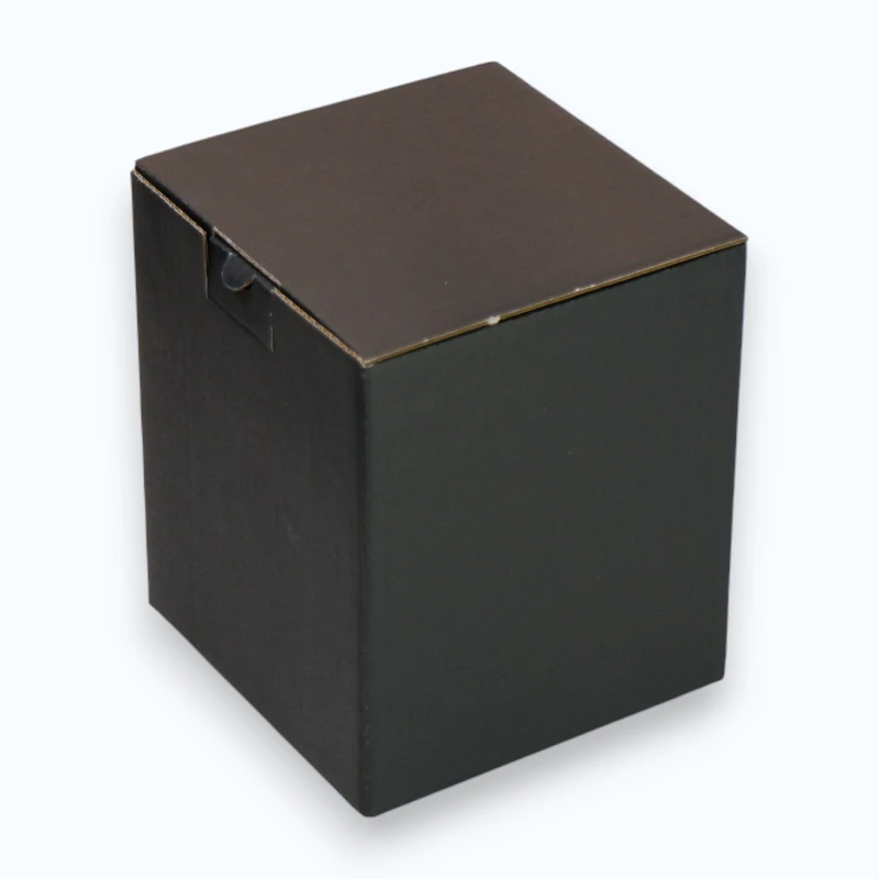 Karton fasonowy o pionowej orientacji, charakteryzujący się kwadratową podstawą (110 x 110 mm) oraz większą wysokością (130 mm). Wykonany z 3-warstwowej tektury (mikrofala E) o gramaturze 385 g/m². Pudełko z zewnątrz jest w kolorze matowej czerni, a wewnątrz pozostaje w naturalnym, brązowym kolorze tektury.
