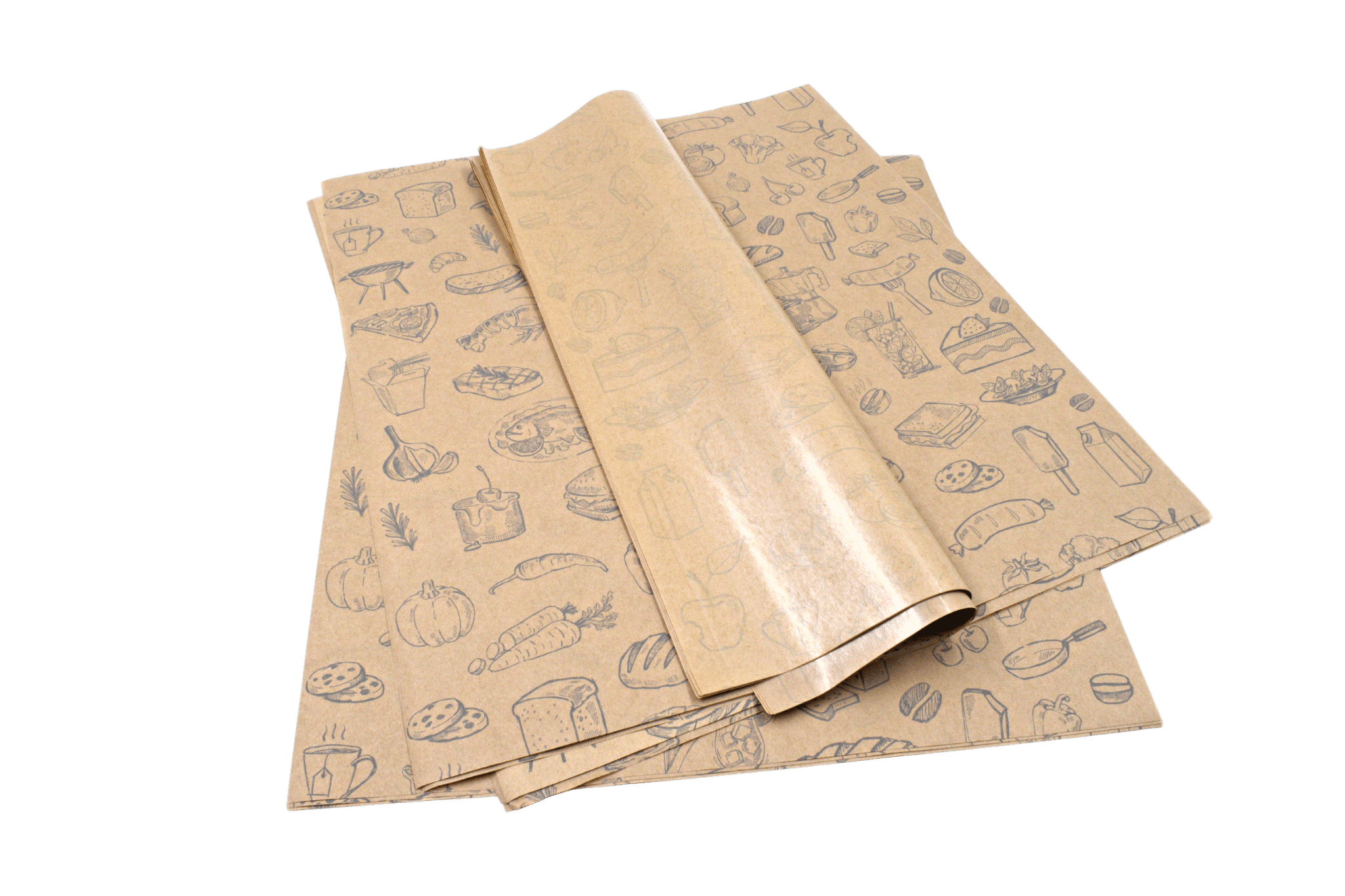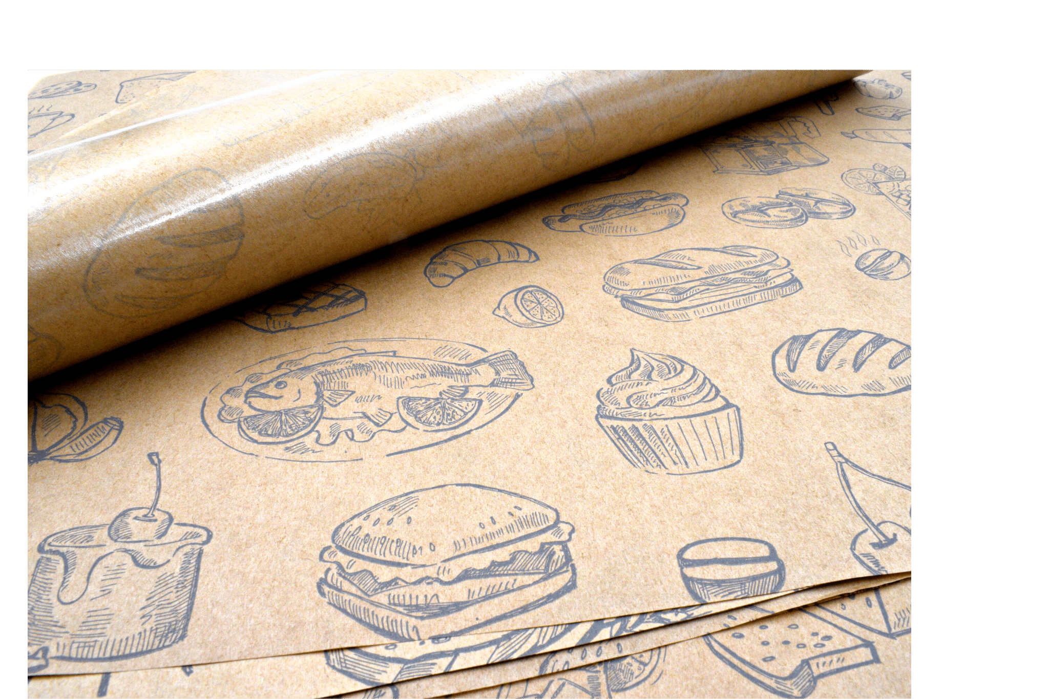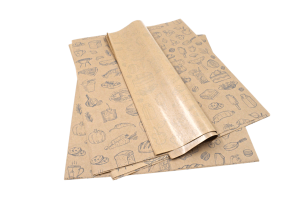 Brązowy papier tłuszczoszczelny powlekany PE z kultowym nadrukiem gastronomicznym. Idealnie docięte arkusze ułatwiające szybkie pakowanie wędlin i mięs.